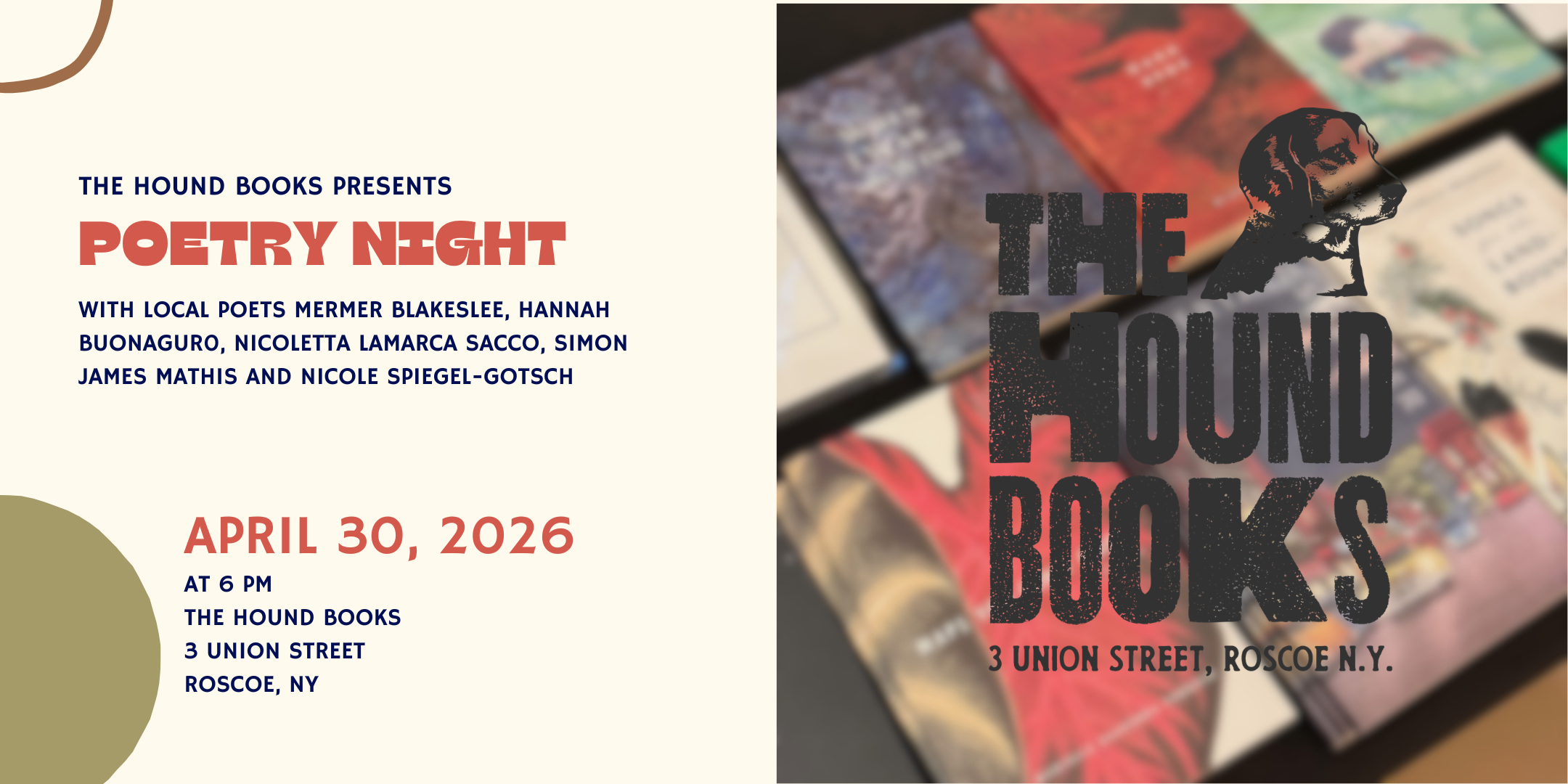 Poetry Night at The Hound Books in Roscoe Thursday, April 30, 2026 6:00 PM 8:00 PM 18:00 20:00 the hound books roscoe, ny (map) Google Calendar ICS GET INFO & RSVP